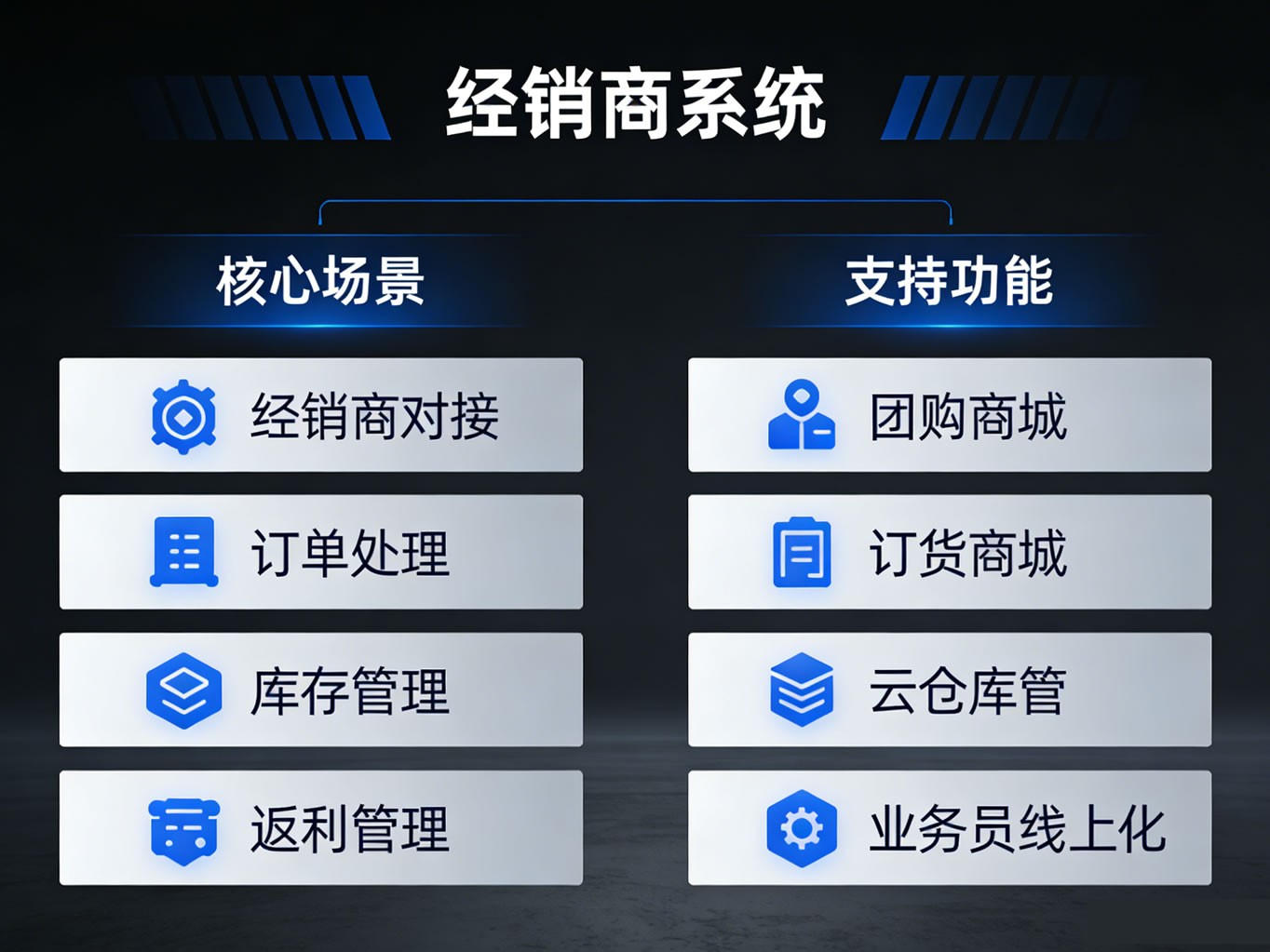 专为经销商打造的数字化渠道管理与运营平台,聚焦经销商对接、订单处理、库存管理、返利管理等核心场景,助力经销商实现数字化运营,提升渠道管控能力。