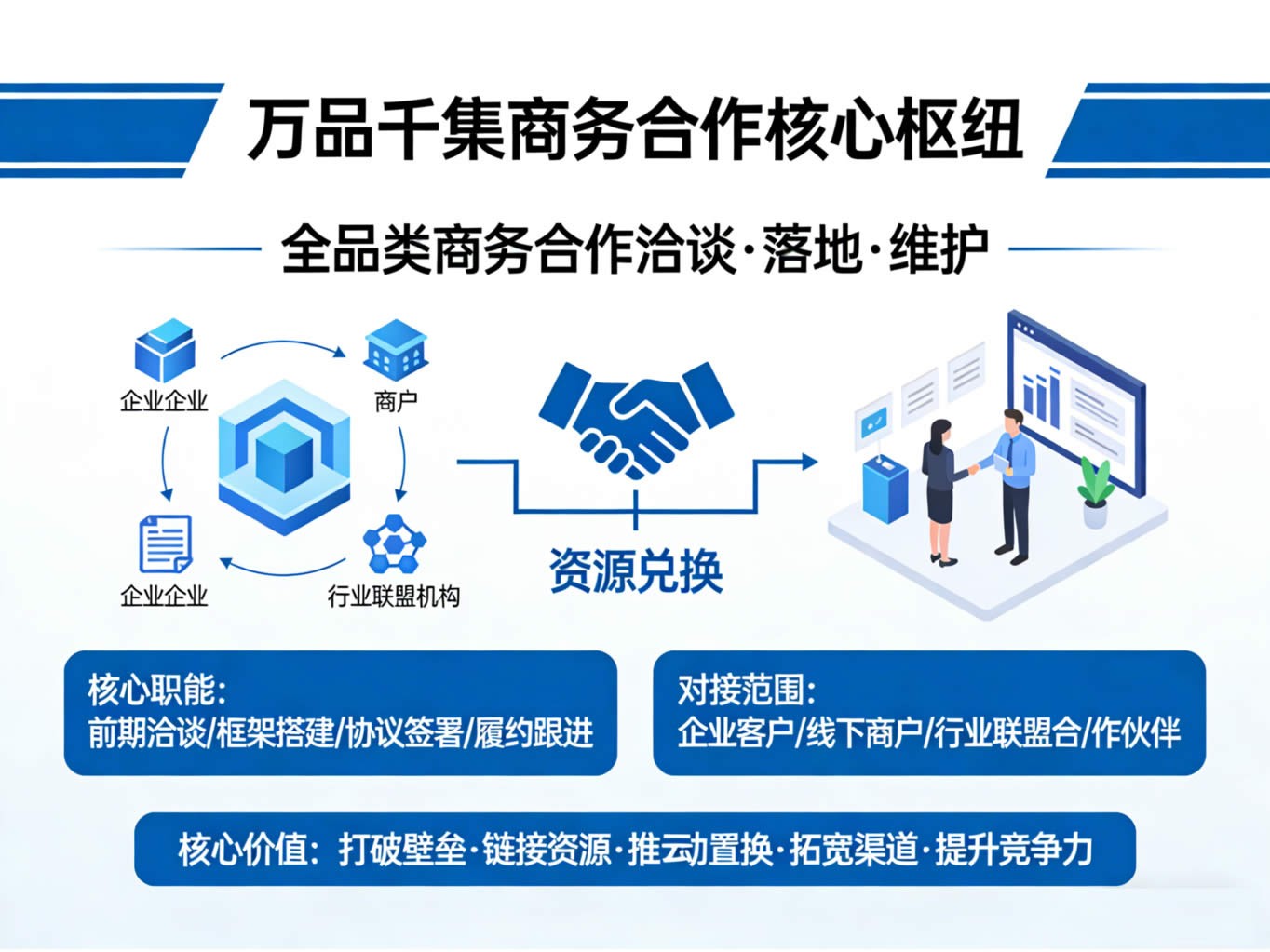 面对市场多元化需求差异:个人侧重生活便捷服务,实体门店需要营销引流与供应链协同,企业需要全链路数字化管理与数据赋能。万品千集深耕市场多年,沉淀完善且灵活适配的数字化解决方案体系,覆盖生活服务、供应链管理、营销运营、数据分析等全维度场景。精准匹配不同用户核心痛点,为个人简化日常数字生活;为实体店打通引流、运营、供货全流程,降本增收;为企业定制全链路数字化体系,优化供应链、提升管理效率,全方位助力数智化升级。